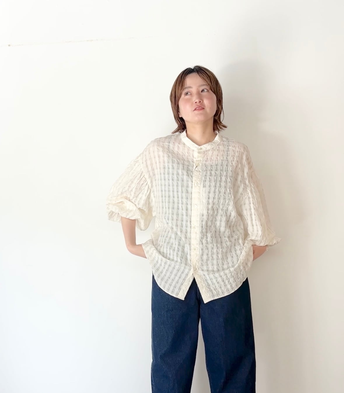 US253BL024 シースルーギンガム/フレンチリネン ギャザースリーブブラウス