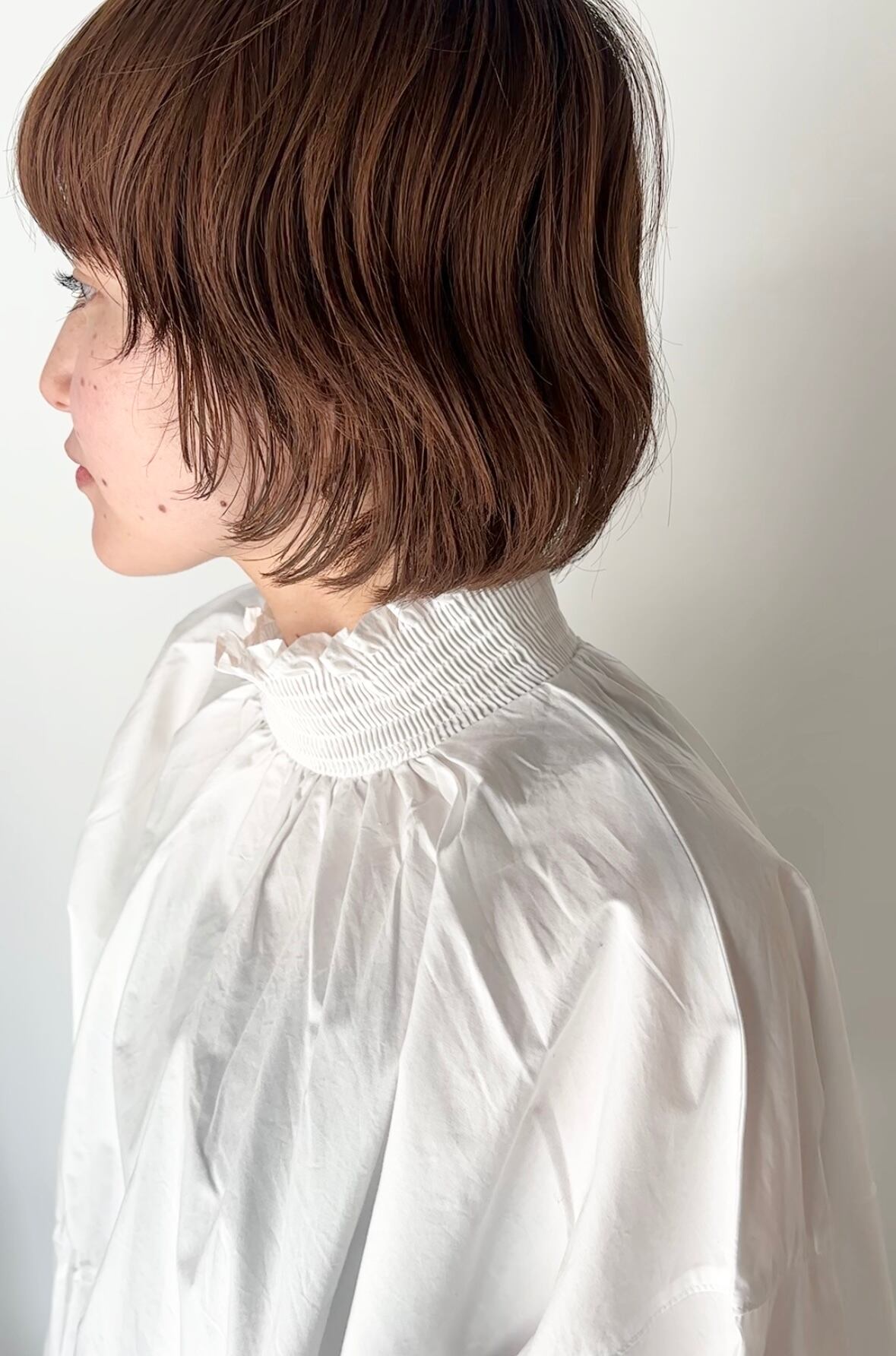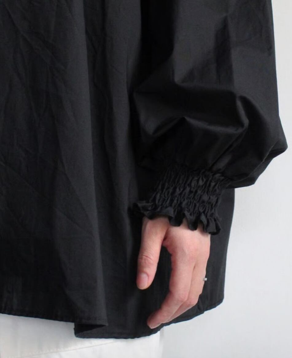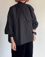 襟ぐりからギャザーを寄せて広がるシルエットや