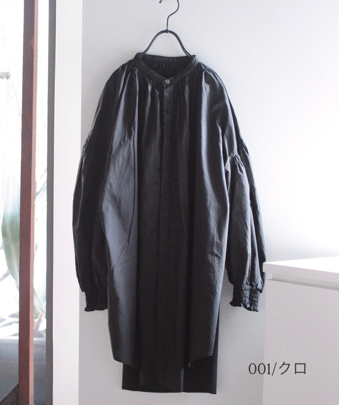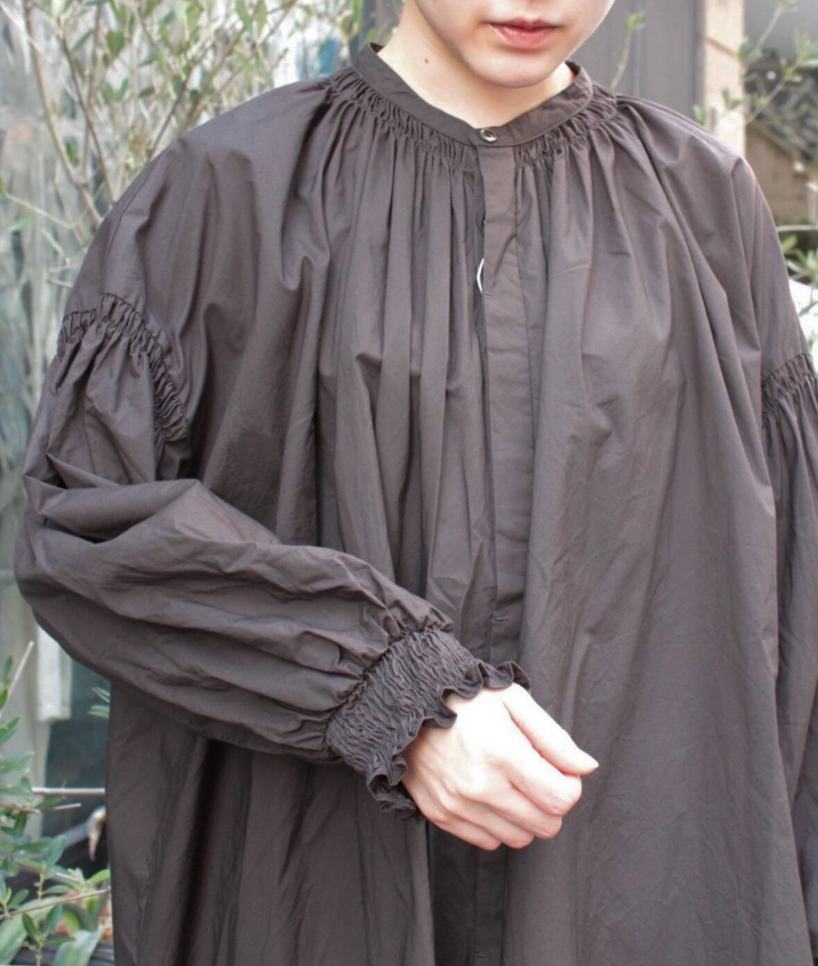 首元はすっきりとしたバンドカラーデザインでシルエットにメリハリをプラス。